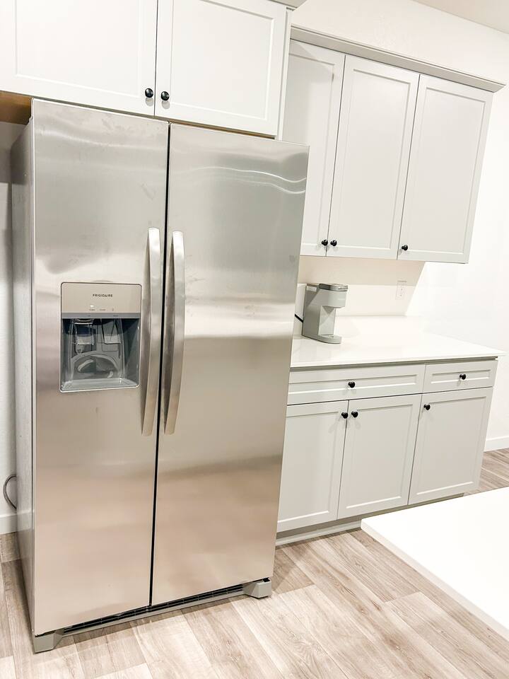 - Hot water kettle, Toaster, Dining table, Keurig Coffee machine and coffee pods, cooking utensils, pots and pans.